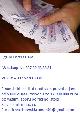 LEgalni i brzi zajam.Whatsapp. + 337 52 43 33 81 VIBER: + 337 52 43 33 81 Financijski institut nudi vam pravni zajam od 5.000 eura u rasponu od 17.000.000 eura po vašem izboru po fiksnoj stopi. Za više informacija: e-mail: szachowski.roman01@gmail.com |